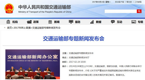 2017年2月24日上午10時,交通運輸部舉行了本年度第一次例行新聞發(fā)布會,本次專題發(fā)布會由交通運輸部、國家發(fā)改委、中國人民銀行聯(lián)合舉行,介紹《關(guān)于對嚴(yán)重違法失信超限超載運輸車輛相關(guān)責(zé)任主體實施聯(lián)合懲戒的合...